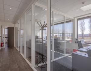 Binnenkant kantoor in bedrijfspand Terberg Gent. De kantoren hebben muren die bestaan uit ramen met witte omkadering. De afbeelding is genomen vanaf de gang.