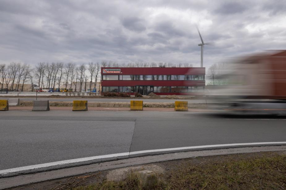 Zijaanzicht bedrijfspand Terberg Gent. Achteraan is het magazijn, dit deel van het gebouw is grijs. Vooraan en dus rechts op de foto is het kantoor. Het kantoor heeft een rode kleur.